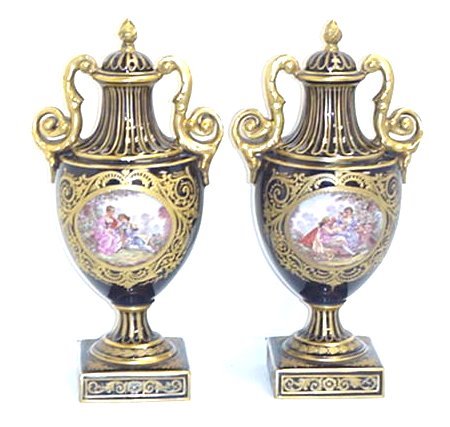 SoldPR. OF SEVRES STYLE PORC CAPPED URNSPair of imposing Sevres style cobalt porcelain covered urns having knop bronze finial and fine detailed handles, with courting scene reserves front and back, highlighted by raised gold relief restingSee Sold Price