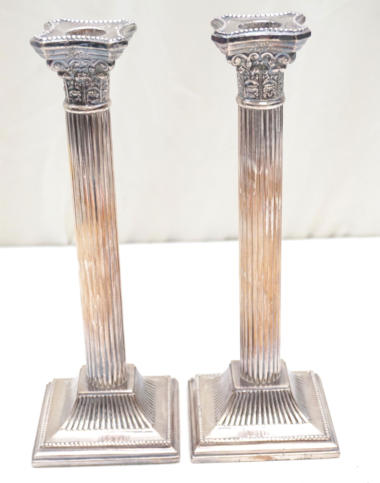 PAIR SILVERPLATE CORINTHIAN COLUMN CANDLESTICKS