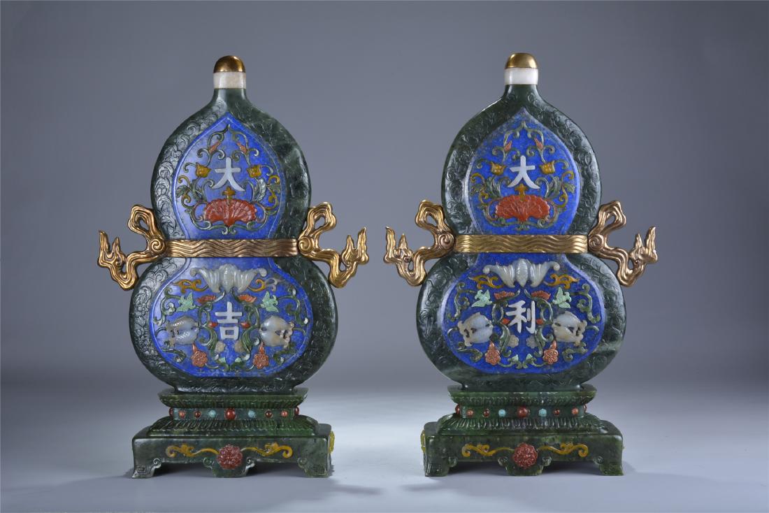 Pair spinach jade mounted gem stone inlay lapis lazuli