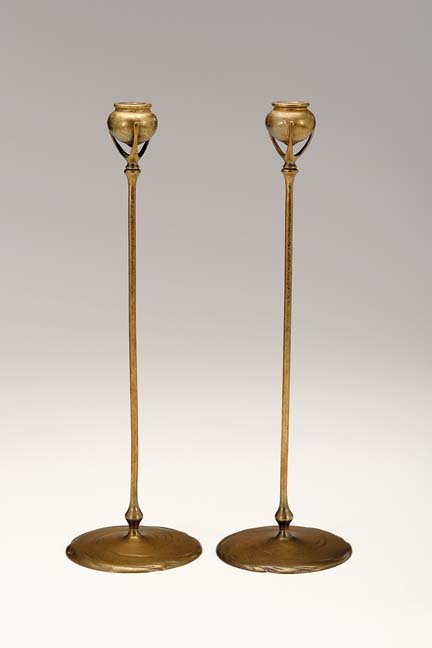 Pair Tiffany Studios gilt bronze candlesticks, ci