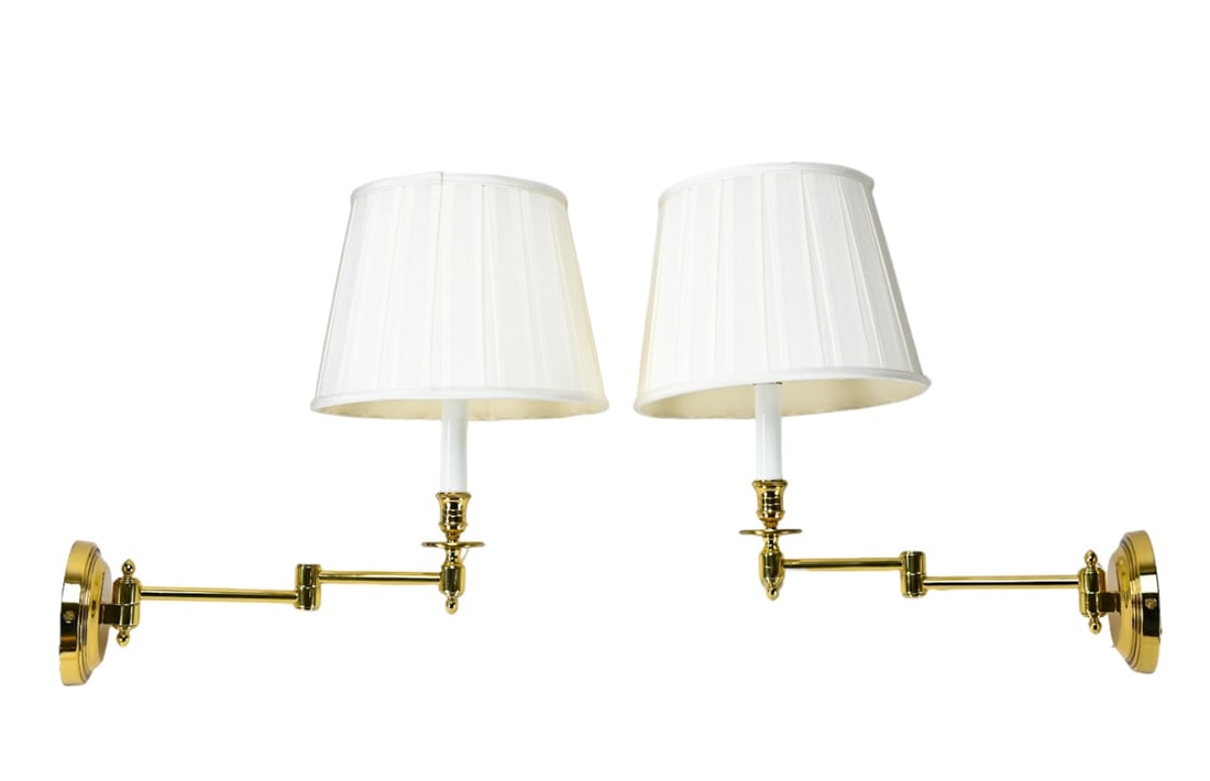SoldPair of Brass Adjustable Swing Arm Wall Sconces, ModernA Pair of Brass Adjustable Swing Arm Wall Sconces, Modern. Dimensions: Height excluding shades 12 3/4in; width 10 1/2in; depth 7 3/4in. Provenance: Property from a Philadelphia Main Line Collection.See Sold Price