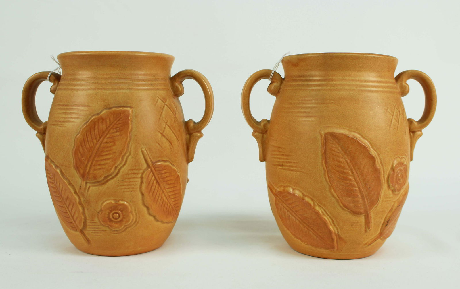 Pair Weller Pottery Leaf and Flower Handled Vases