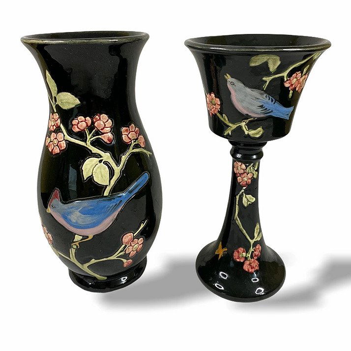 SoldWeller Pottery Rosemont VaseA Weller Pottery Rosemont vase, featuring a bulbous form with a flared rim and hand-decorated design of a blue bird perched among flowering branches against a rich black ground. The raised slip decoraSee Sold Price