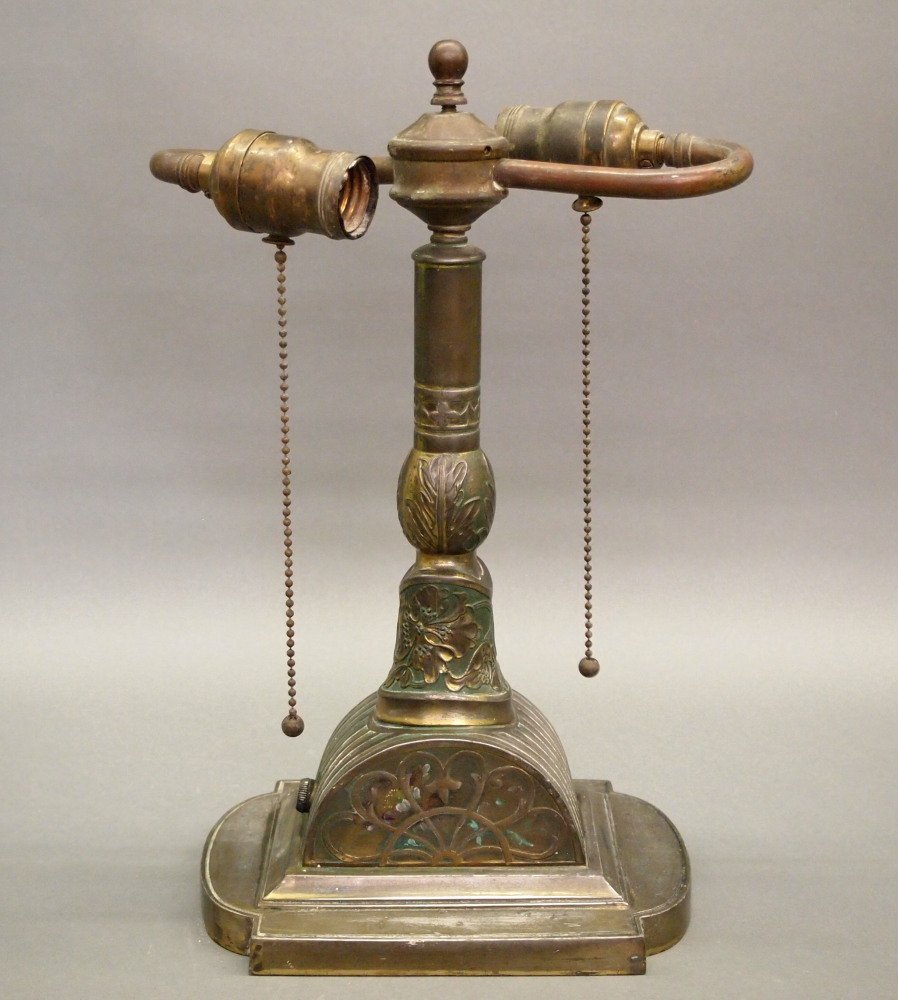 SoldPAIRPOINT LAMP BASEcirca 1900-1950 patinated metal Condition: with loss to patina throughout 23 total inches highSee Sold Price