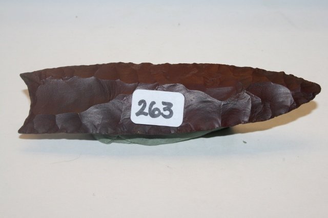 SoldPaleo Points (2) [154992]Two Paleo Indian points acquired from Lighthouse Antiques in Gordon, Nebraska in 1976-77. One reddish-brown chert fluted point 4 inches long. One white chert point also 4 inches long. Date: Country (iSee Sold Price