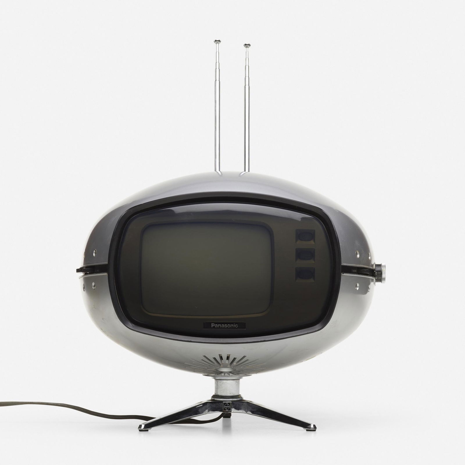 SoldPANASONIC TR-005 ORBITEL ROTATING TELEVISION SETJapan, circa 1970s. Space age design transister TV in chrome, plastic & metal. Supported on tripod base, pair of telescopic antenna attached to the back. H. of television 25 cm (9 7/8 in) H. with exteSee Sold Price