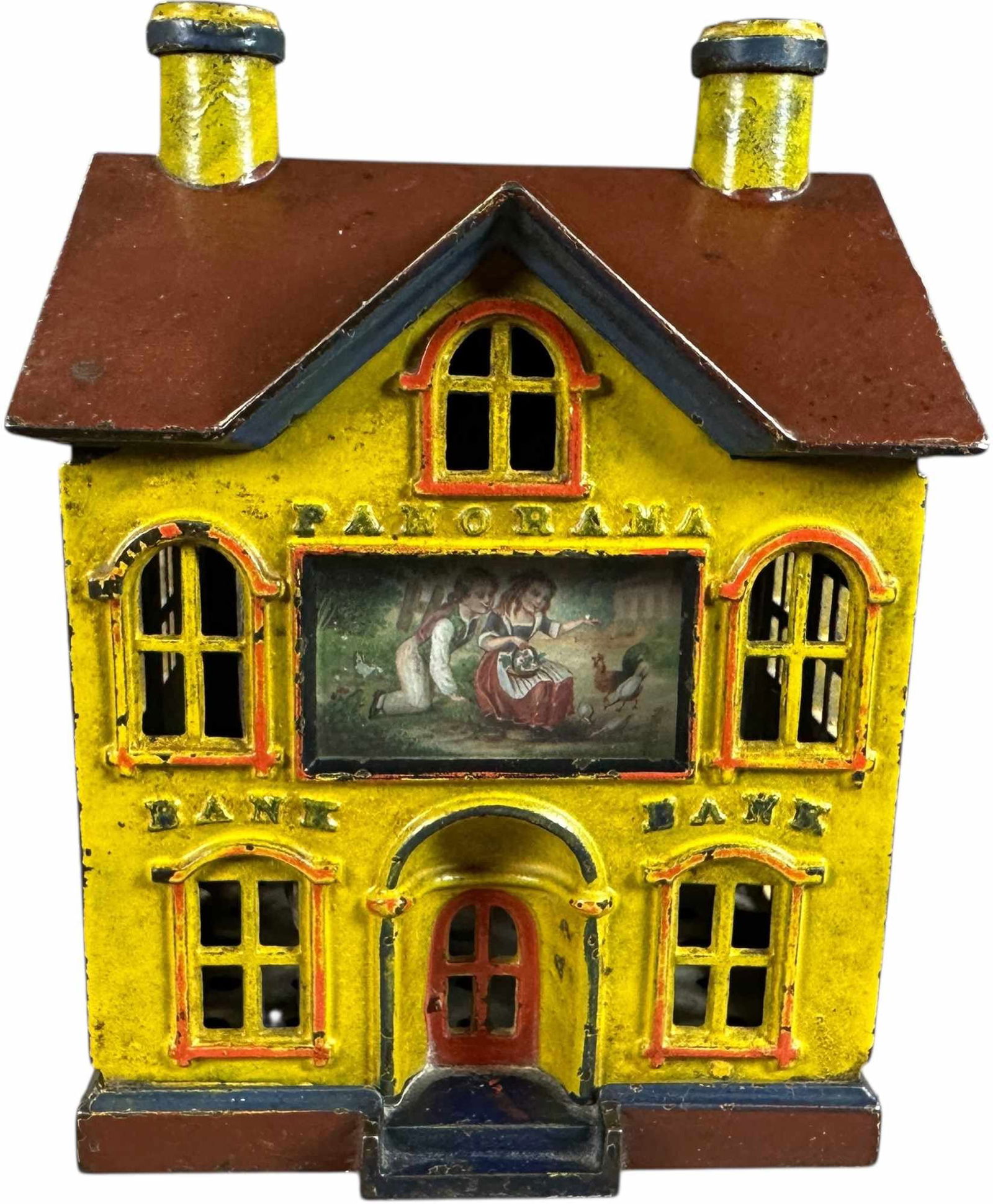 SoldPanoramaPanorama Mechanical Bank manufactured by J. & E. Stevens of Connecticut, circa 1880's. The bank is 6.5" tall and made of cast iron. The bank is repainted, the back left corner of the roof is broken ouSee Sold Price