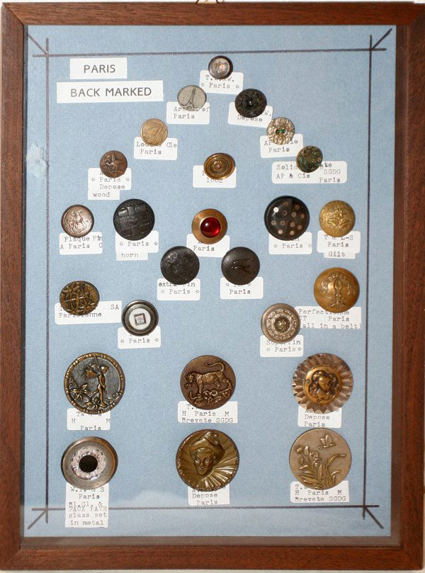 PARIS BACK-MARKED BUTTONS 25 ASSORTED, FRAMED