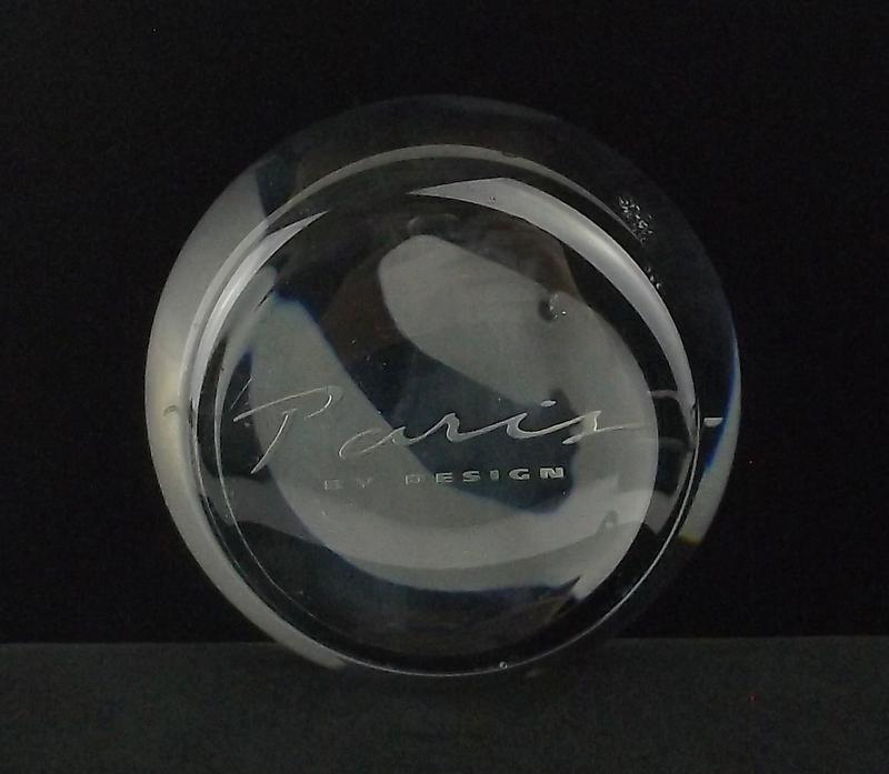 SoldRitter Art Glass PaperweightRitter crystal paperweight with interior design of blue millefiori and green and white swirling clouds, signed Richard Ritter; 2 3/4 diameter. CONDITION: no chips, cracks, repairs, or material defectsSee Sold Price