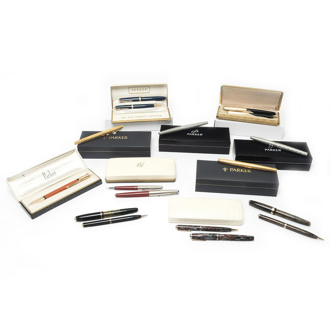 SoldParker Fountain Pens, Pen & Pencil Sets16 Parker pens comprising: 8 fountain pens; 2 fountain and pencil set, 18k "750" nib, salmon orange and black with gold trim; pen and fountain pen sets including Castell fountain pen. Wear and surfaceSee Sold Price