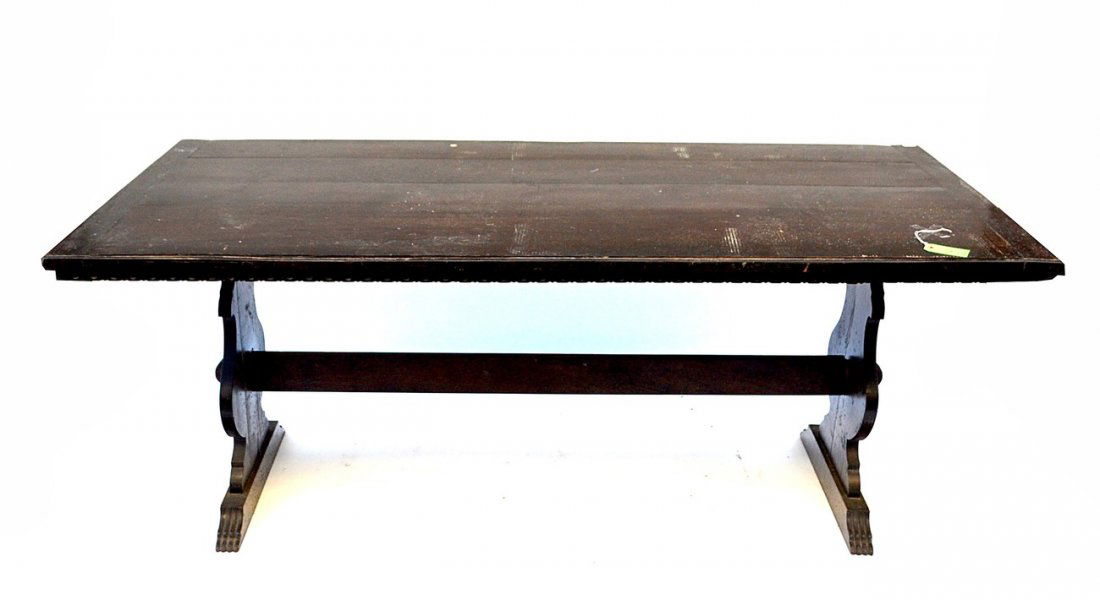 A farmhouse oak trestle table, of recent manufacture,Mar 18, 2026CERUSED OAK DINING TABLE OR WRITING DESK WITH MORTIS AND TENON CONSTRUCTION C 1940.1 hr LeftDUTCH PINE FARMHOUSE DINING TABLEMar 06, 2026English Oak Tavern Table, 18th Century143 Lots AwayLouis XIV Style Solid Oak Farmhouse Table5 days LeftA Continental Baroque style oak refectory table, incorporating antique elements2 hrs LeftFrench Solid Oak Monastery / Farmhouse Table5 days LeftEARLY ONE DRAWER TAVERN TABLE3 days LeftAmerican Pine Sawbuck Dining TableMar 15, 2026A large farmhouse table, of recent manufacture,Mar 17, 2026Chinese Hardwood Altar Table23 hrs LeftNatural Teak Live Edge Double Pedestal Dining Table 126"20 hrs LeftFARMHOUSE DINING TABLE AFTER PERRIANDMar 06, 2026Tuscan Style Rustic Walnut Dining Table 8-Ft Double Pedestal20 hrs LeftAntique Style Reclaimed Mindi Wood Dining Table 86x392 days LeftTrestle Table4 days Left