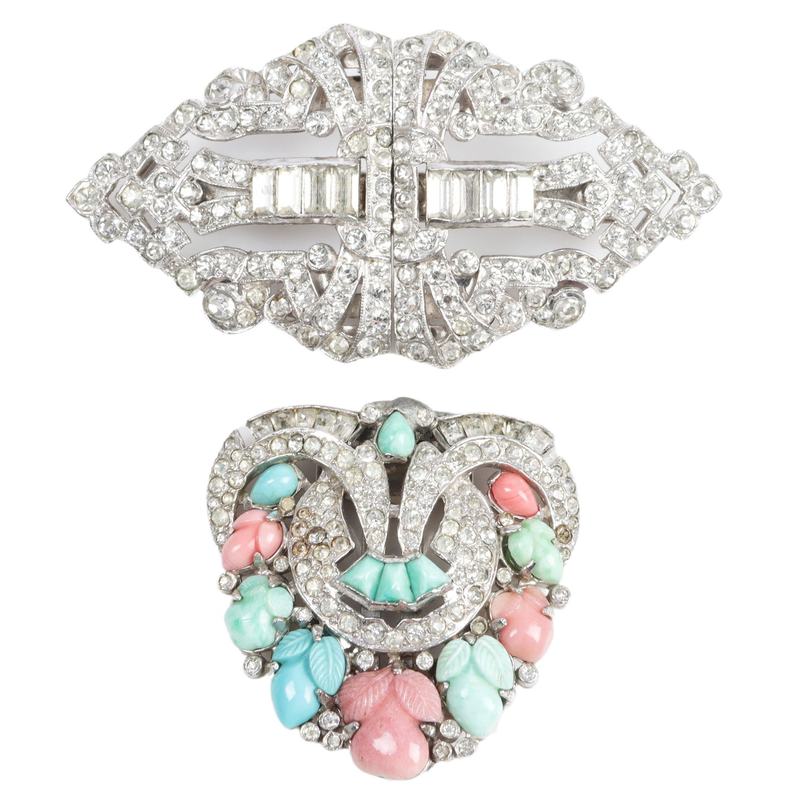 Vintage 2pc Trifari: diamante clipmates pin clip and unsigned pastel fruit salad clip. 2 1/2"H x 1