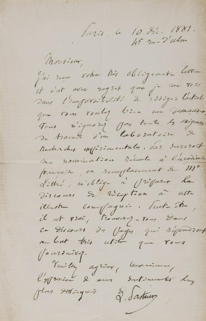 Pasteur (Louis) Autograph Letter signed [to Walter