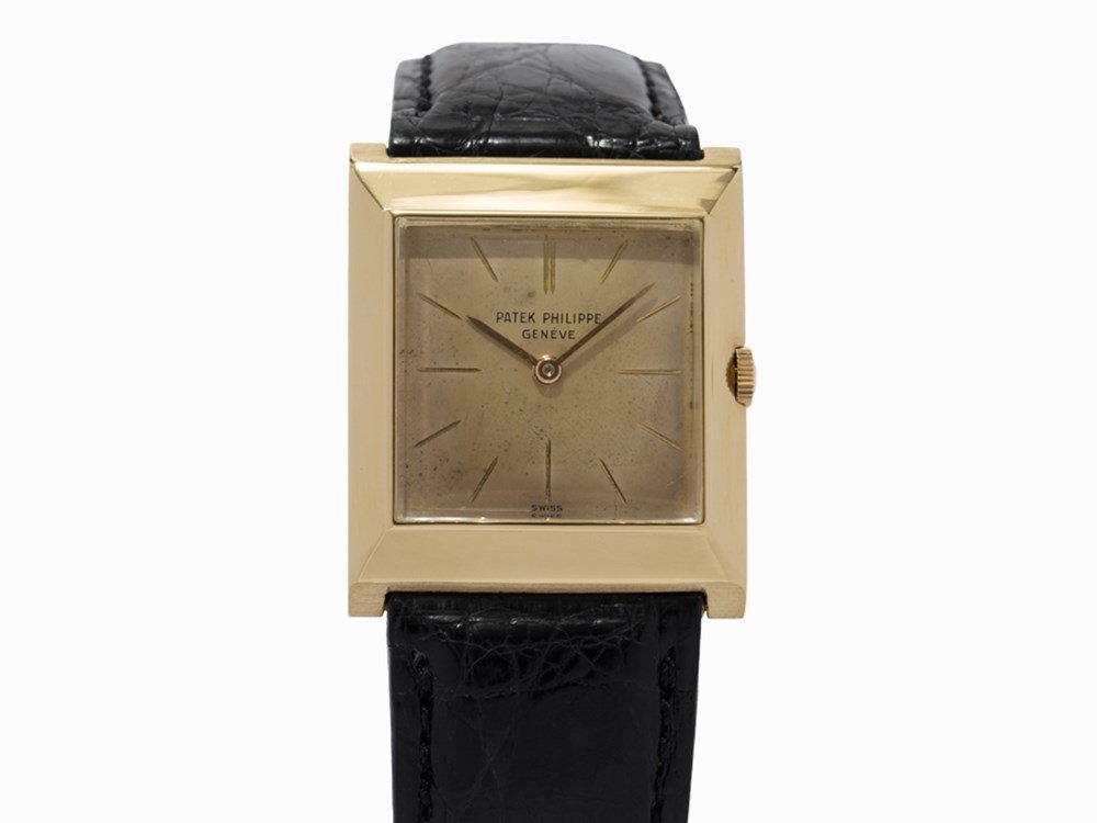 Patek Philippe Vintage Square Ref 1575Patek Philippe Vintage Square (1575) manual-wind watch, features a 25mm 18k yellow gold case surrounding a champagne dial on a brown leather strap. Functions include hours, minutes, and small-seconds.See Sold Price