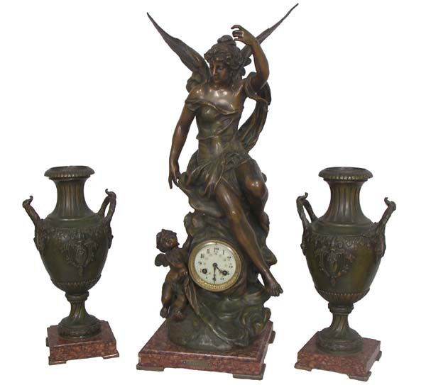 Patinaed bronzed 3 pc. clock set w/winged lady