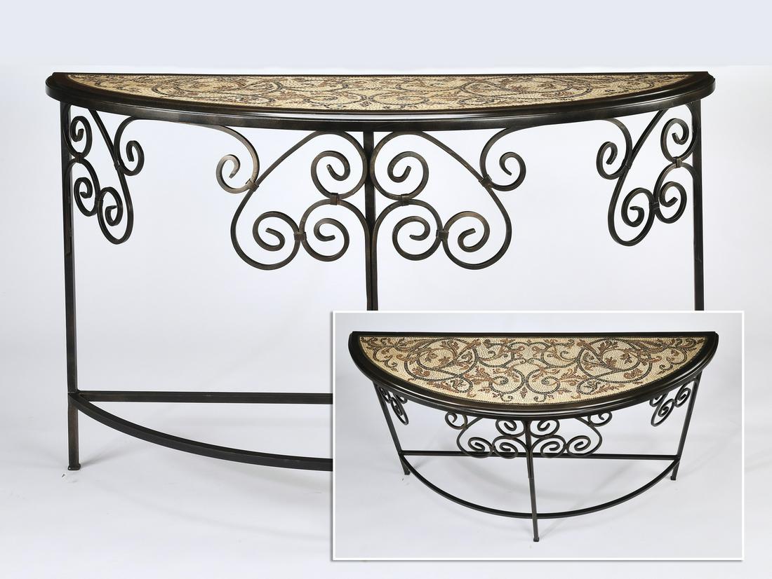 SoldOutdoor Metal Console Table W Glass TopConsole table is metal, appears to be iron. Base is green toned w c curve structures & supports which resemble rope that begin at sides and end in center. Tabletop is rectangular shaped beveled glass.See Sold Price
