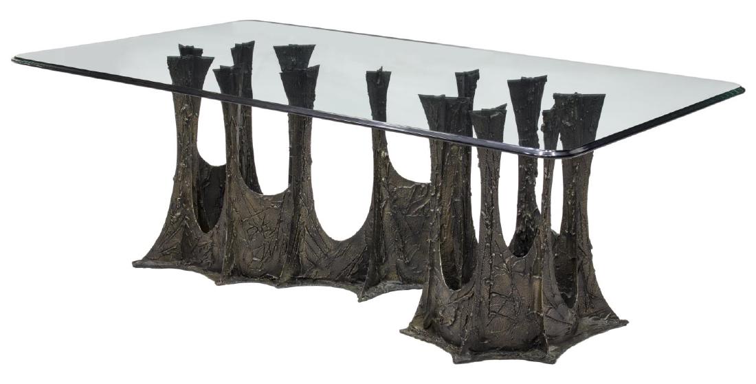 SoldPaul Evans PE Brutalist Stalagmite Dining TableBronzed resin over steel with thick glass top in rectangular shape. Signed P.E. 69. Base measures 28" x 64" x 32". Glass measures 84" x 48". Good condition with mild surface wear and patina. ScratchesSee Sold Price