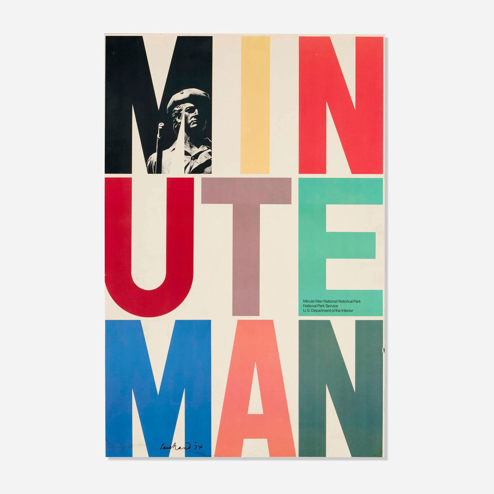 SoldPaul Rand, (1914-1996) Minute Man PosterPaul Rand, American (1914-1996) Poster on Board "Minute Man National Park 1975". Signed Lower Left. Unframed. Condition: Generally Good, Dirty.Dimensions: 42" x 28".Please note the absence of a ConditSee Sold Price