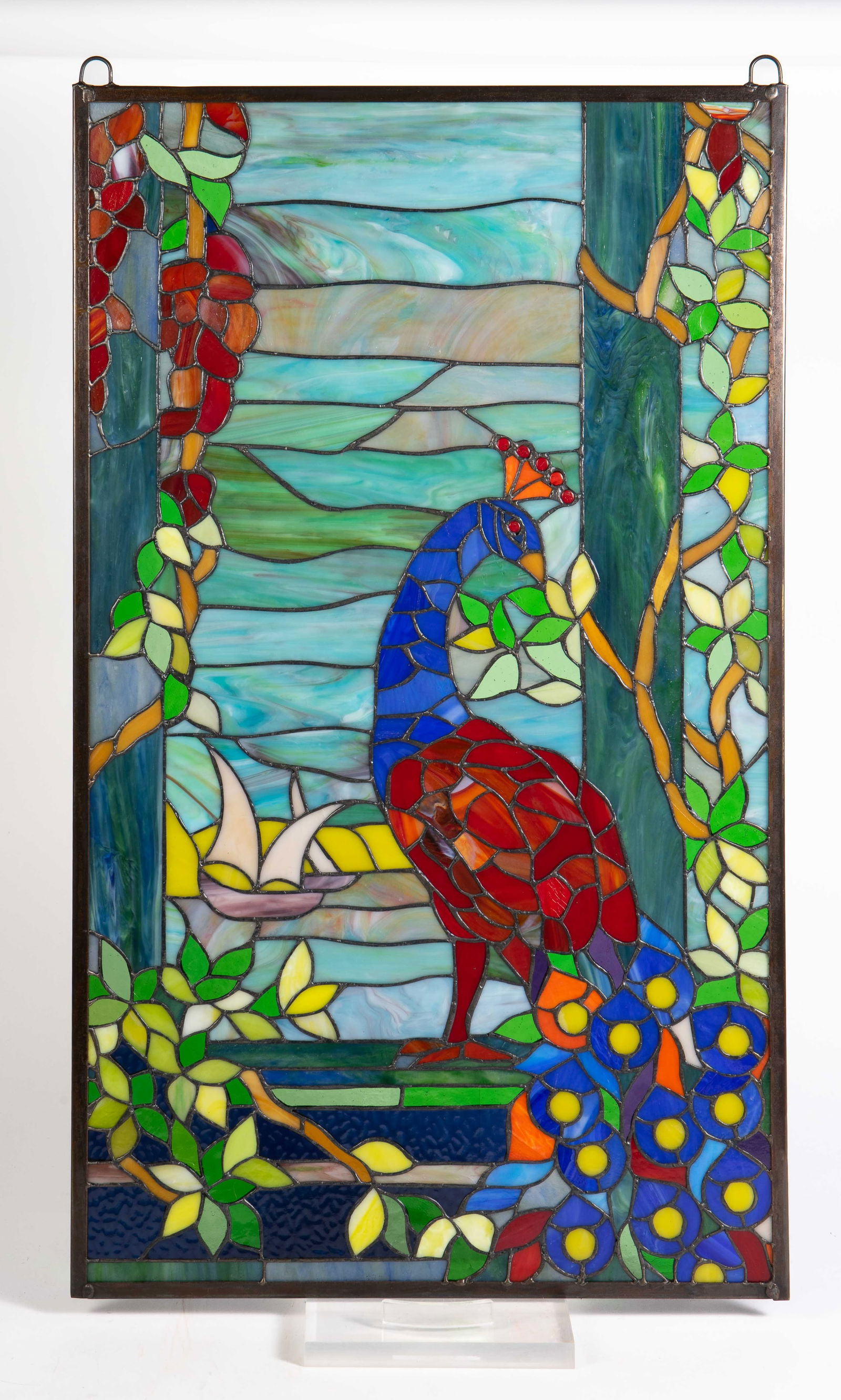 SoldPeacocks Paradise Stained Glass Wall HangingStain glass window wall hanging. Mosaic depicts a peacock on a lotus branch. Glass pieces soldered together. Two loops on top for hanging wire. No hanging wire or chain included. Stain glass measuresSee Sold Price