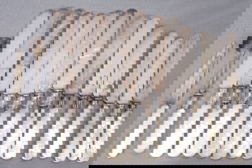 SoldGorham Mother of Pearl-Handled Dinner Knives, 12Gorham mother-of-pearl handled dinner knives, 12, each silver plated steel blade reading "Gorham Mfg. Co."See Sold Price