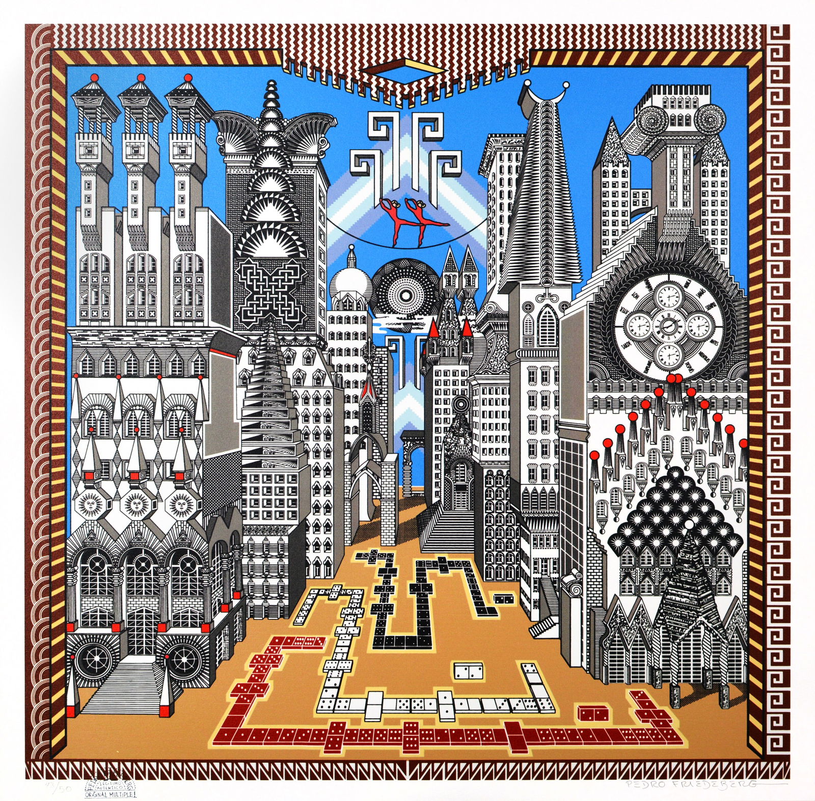 SoldPEDRO FRIEDEBERG (MEXICAN, B. 1936)Pedro FriedebergMexican, b. 1936Malabaristas ParapsicologicosSerigraphSigned in pencil lower right, numbered 41/50 and stamped lower left. Labyrinth city scape with dominos and acrobats, matted and frSee Sold Price