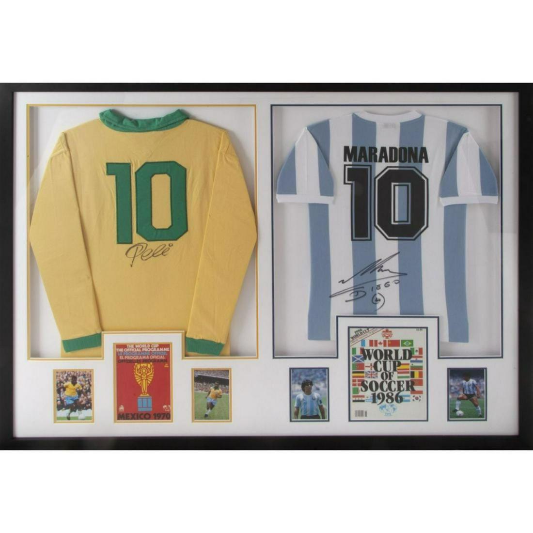 SoldPELE AND MARADONA SIGNED JERSEYS DISPLAY (JSA)Pelé and Diego Maradona signed jersey display. A framed display of signed jerseys from Pelé and Maradona, arguably the two greatest players to ever play the beautiful game. Both athletesSee Sold Price