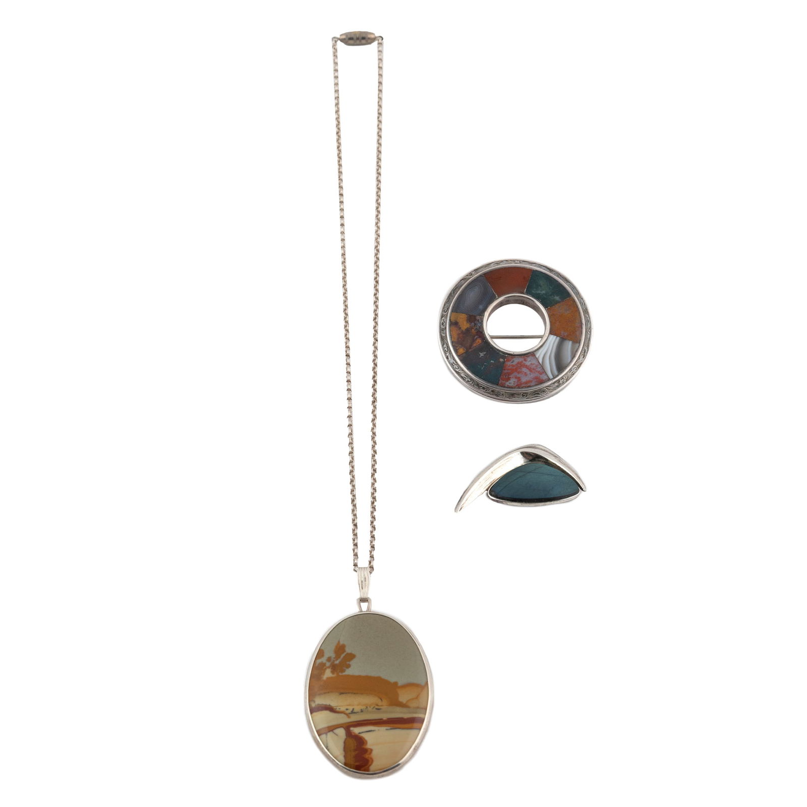 Pendant and two brooches with silver mount