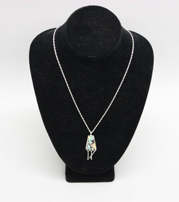 SoldQuoc Turquoise Co. Sterling Inlay Pendant NecklaceQuoc Turquoise Co. Albuquerque New Mexico Native American Sterling Inlay Pendant Necklace, sterling chain measures 17'' end to end and pendant measures 1''L x .75''W, hallmarked QT and stamped sterlinSee Sold Price