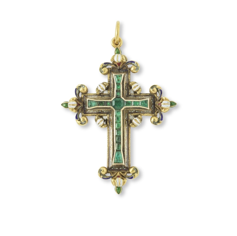 PENDENTIF 'CROIX' ÉMAIL ET ÉMERAUDES
