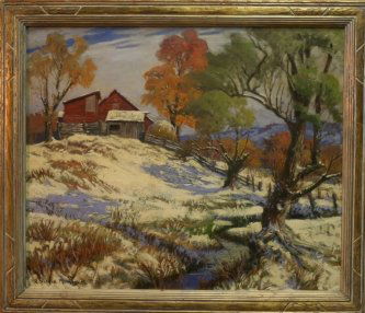 SoldAlbert Sheldon Pennoyer (1888-1957) AmericanTIBBETTS HOMESTEAD, oil painting on board, signed lower right, 8 x 12”, framed, a few edge chips nearly covered by frame, otherwise in good studio condition. Provenance: 1948 letter signed by CarrieSee Sold Price