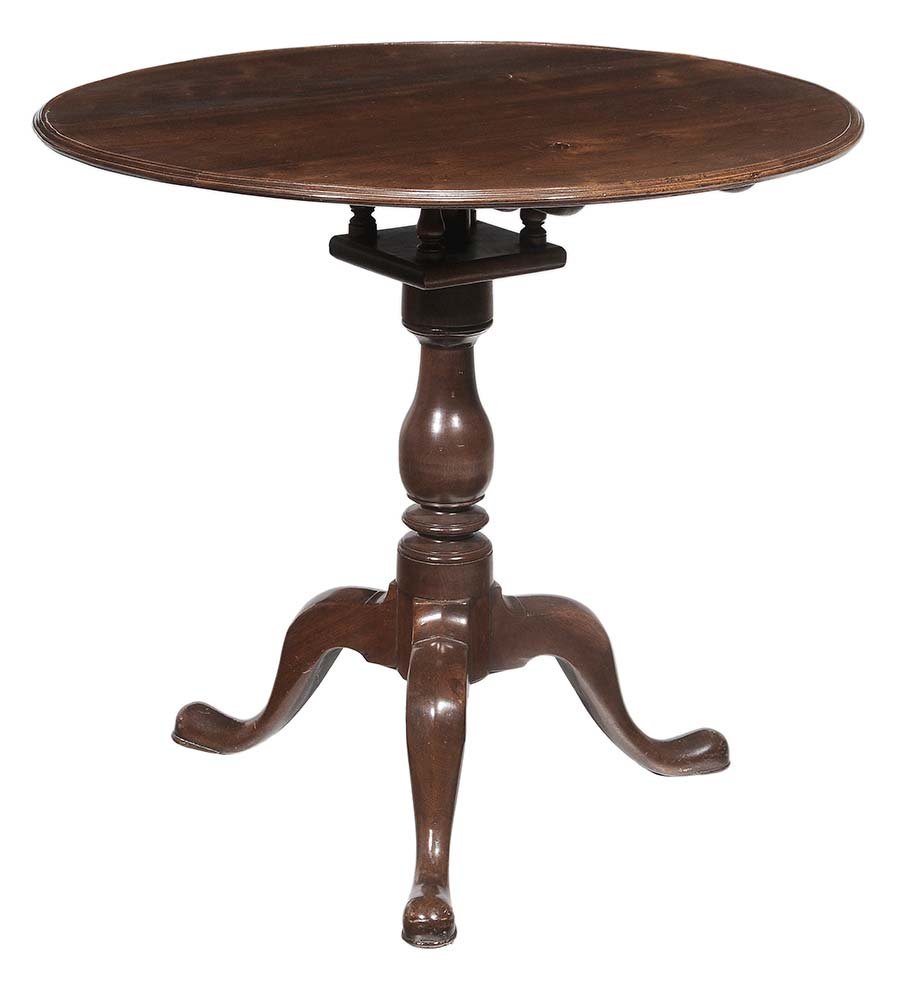 SoldPENNSYLVANIA CHIPPENDALE TILT TOP CANDLESTAND.Third quarter 18th century, walnut. Bird cage dish top with turned column and cabriole legs. Old, alligatored varnish. 28.5"h. 21.5"d.See Sold Price