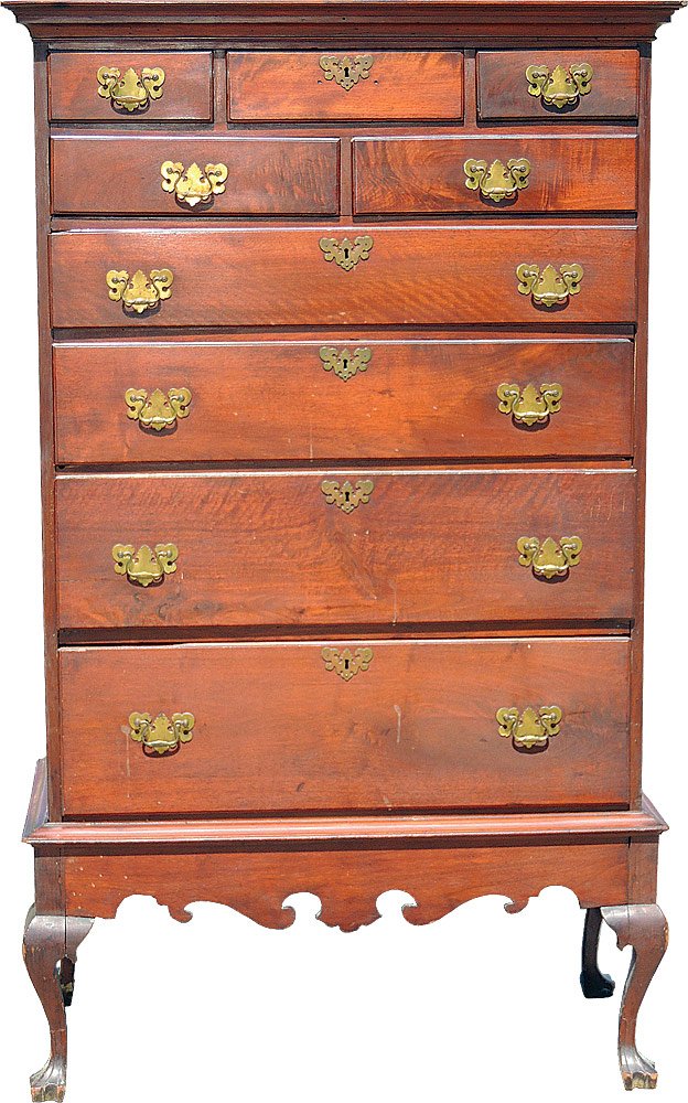 SoldPennsylvania Queen Anne Walnut Chest on FrameA Pennsylvania Queen Anne Walnut Chest on Frame, Third Quarter 18th Century. The upper section with three over two short drawers over three long graduated drawers. The upper three drawers with QuSee Sold Price