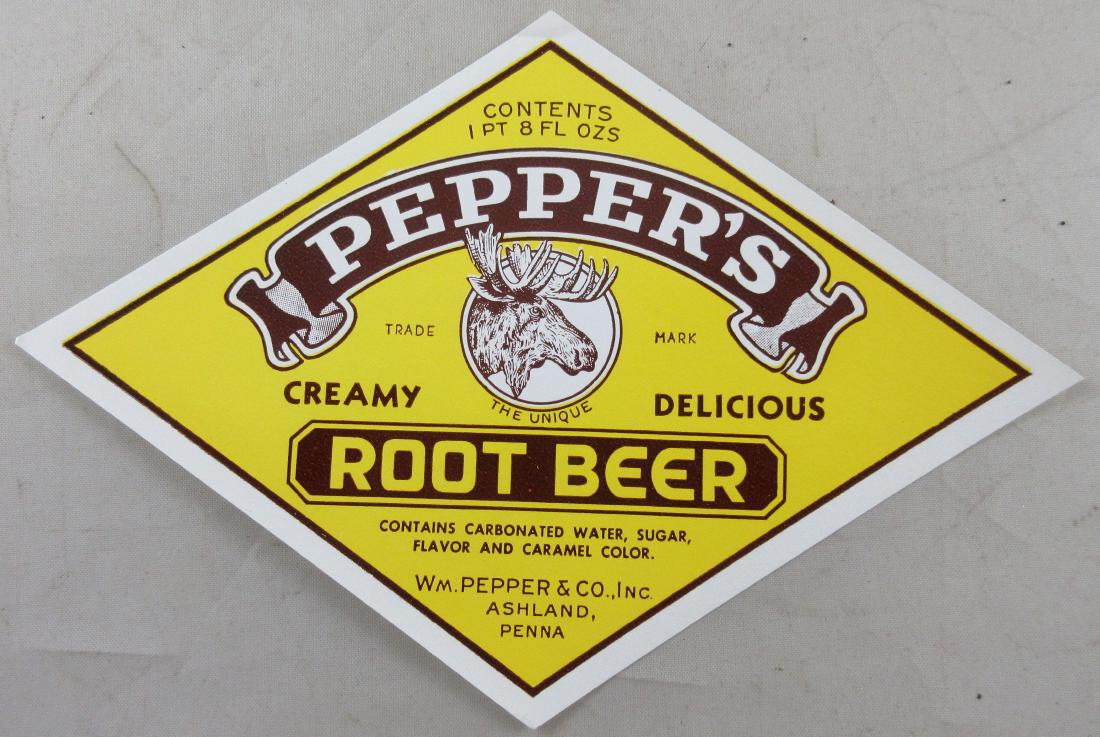 Pepper's Root Beer Bottle Label with Moose. 6” wide.