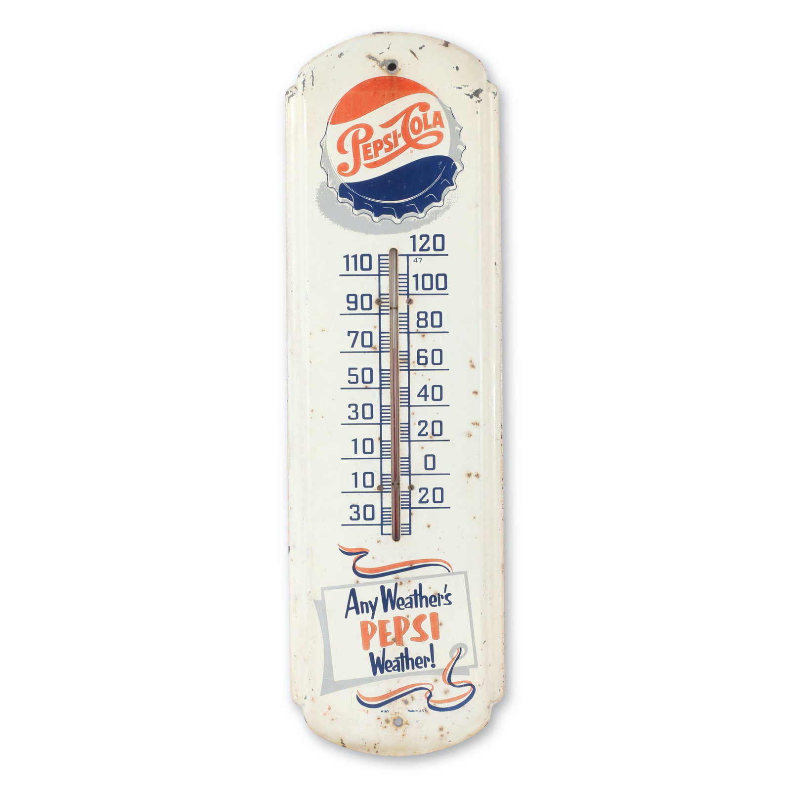 Vintage Coca-Cola Tin Litho Advertising Thermometer 2.5"X9"4 days LeftVintage Pepsi Cola Advertising Thermometer22 hrs Left1950's-60's Coca-Cola Tin Advertising Thermometer "Drink Coca-Cola In Bottles" 3"X9.5"4 days LeftPepsi Cola Thermometer, 1970s in Great ShapeApr 27, 2026Vintage 1930s Wooden Bigger Better Pepsi-Cola 6 Bottle Carrier3 days Left1950 Coca Cola French Canadian Tin Litho Menu Chalkboard 26'x18' Soda popApr 22, 2026Vintage Pepsi-Cola Porcelain Thermometer Sign - Weather Cold or Hot - Collector?s Item3 days LeftPepsi Cola Delicatessen framed retro style advertising signJul 01, 2025VINTAGE PEPSI TIN ADVERTISING SIGN6 days LeftVintage Coca-Cola & Pepsi Glass Bottles (Lot)Apr 26, 2026Martin Senour Paints advertising thermometer.May 07, 2026Coca-Cola soda fountain dispenser.May 07, 2026Vintage 10K Yellow Gold Diamond Pepsi Cola Tie Tac Brooch5 days LeftVintage Oval Pepsi-Cola Metal Serving TrayApr 30, 20261940s Vintage Pepsi-Cola 10 Gallon Industrial Syrup DrumApr 29, 2026Antique retro style Pepsi Cola delicatessen retro style advertising signJul 01, 2025
