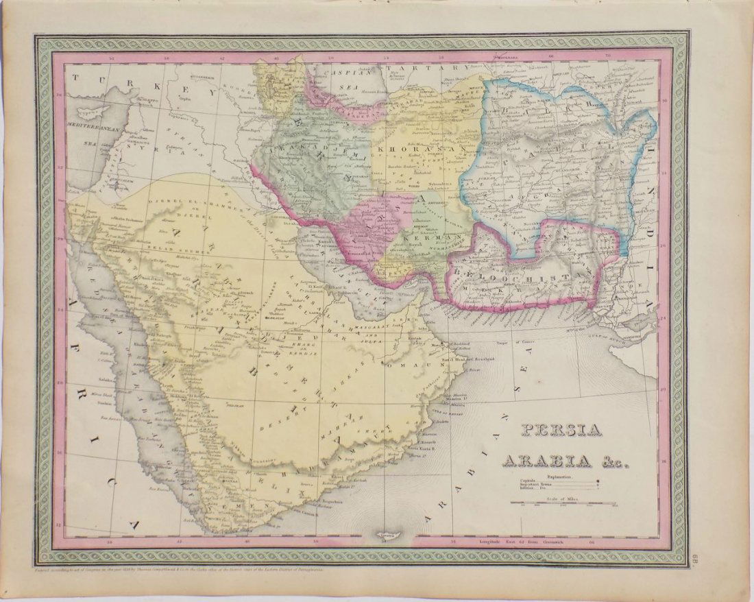 SoldMitchell: Antique Map of Persia, Arabia, 18481848 Persia, Arabia &c. by S. Augustus Mitchell. Vivid original hand coloring. A lovely map. Mild toning to three edges (common for Mitchell maps of this period). From the exceedingly scarce 1848 editSee Sold Price