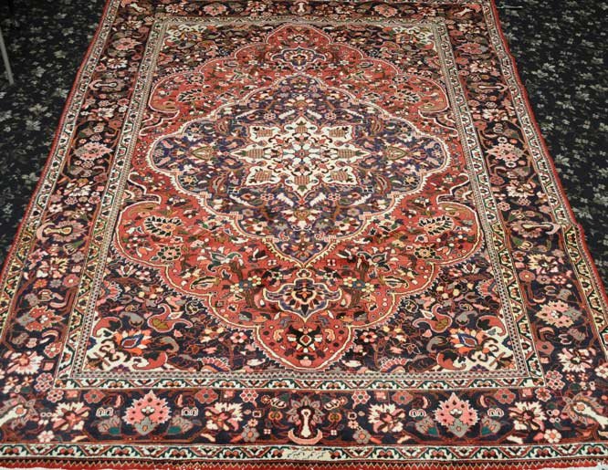 SoldA Post War Baktiari, Persian CarpetWith a large central cream colored ground medallion on a red field with midnight blue corners, the whole decorated with geometric devices. Dimensions:10' 4" x 7' 2". Provenance:From a Main Line collecSee Sold Price