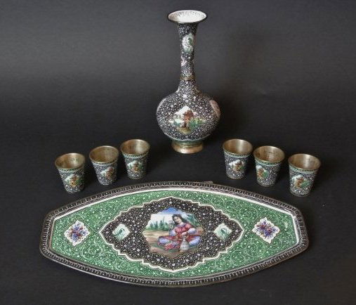 PERSIAN ENAMELED AND SILVER LIQOUR SET