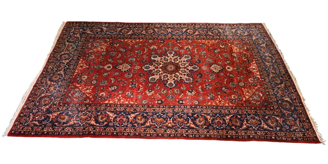 SoldLARGE PERSIAN HAND KNOTTED WOOL CARPET OR AREA RUGA large Persian carpet or area rug made of hand knotted wool. The carpet is adorned with geometrical, foliage, swirl and foliate scroll ornaments against the red ground color. The ware is decorated wiSee Sold Price