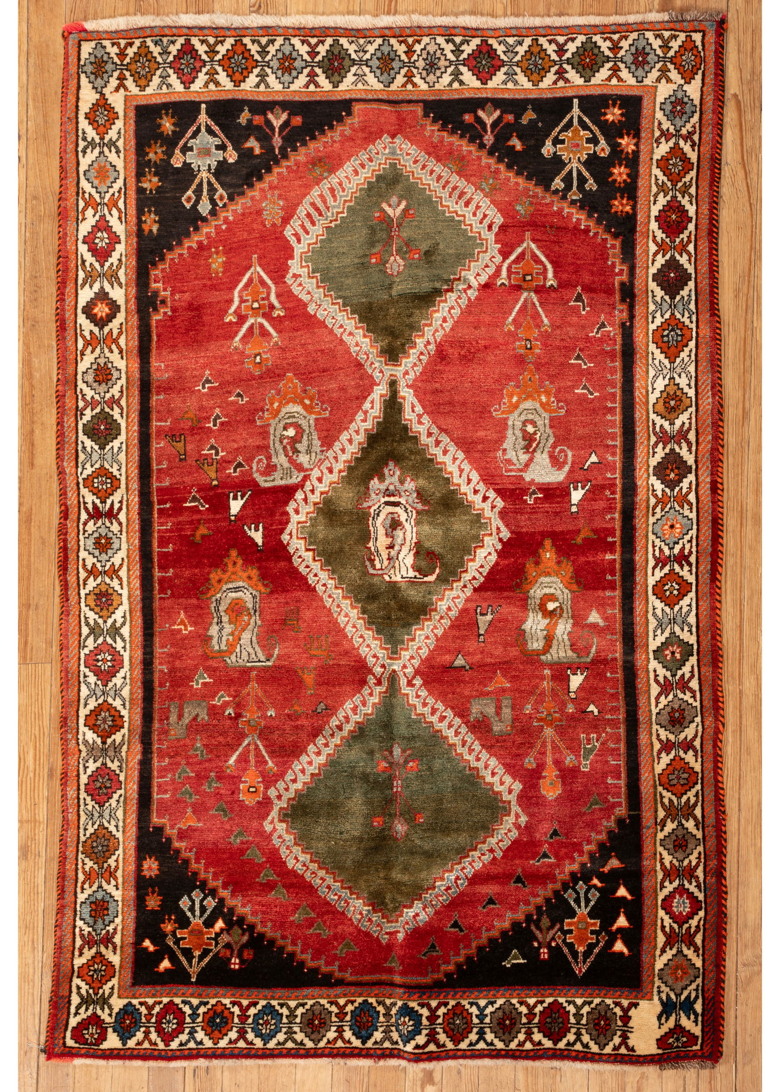 Sold2 Persian Rugs, Shiraz and Hamadan PrayerTwo (2) Persian Carpets, Shiraz and Hamadan Prayer. 1st item: Persian Shiraz rug, wool on wool, having a stylized central diamond design with animals and central rust field with animal, floral and geoSee Sold Price