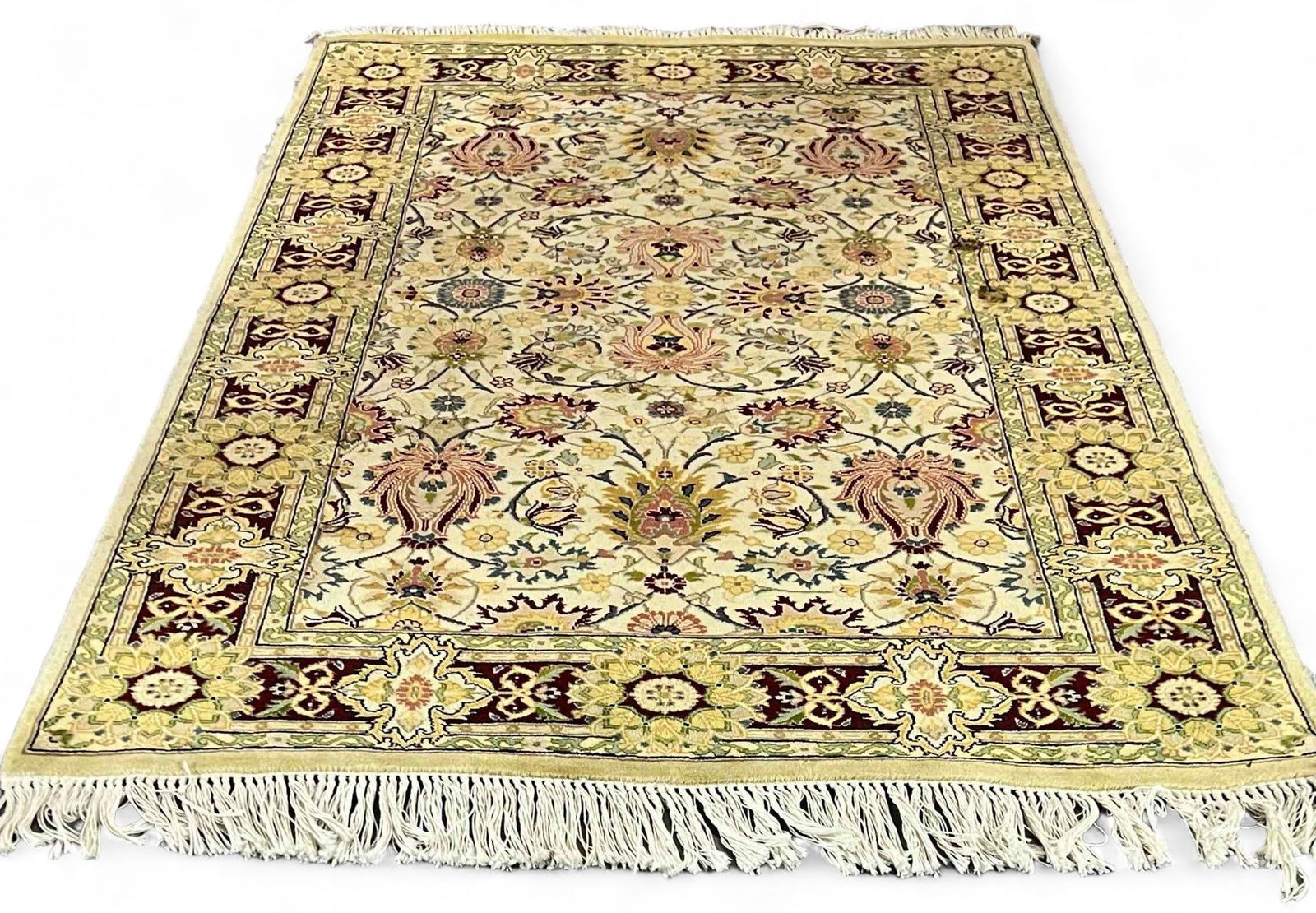 SoldIndo-persian Type Room RugCollectible large Indo-Persian style rug, decorated with elaborate floral patterns on a red ground, with tassels at two sides. 93inch L, 48inch W.See Sold Price