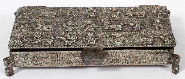 SoldOrnate Repousse 900 Silver BoxThis hand hammered box weighs 14 ounces!It is hallmarked on the bottom as 900 silver (the "sterling" standard is 925/1000). It measures 5 5/8" x 4" and stands 2 1/4" high. Excellent condition. ShippinSee Sold Price