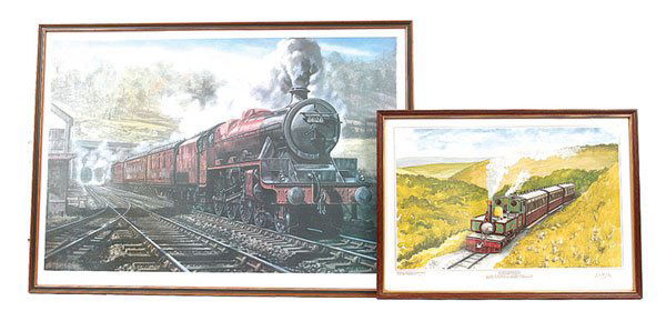 CONTEMPORARY PAINTINGS LOCOMOTIVE AND TRAIN CAR SIGNED