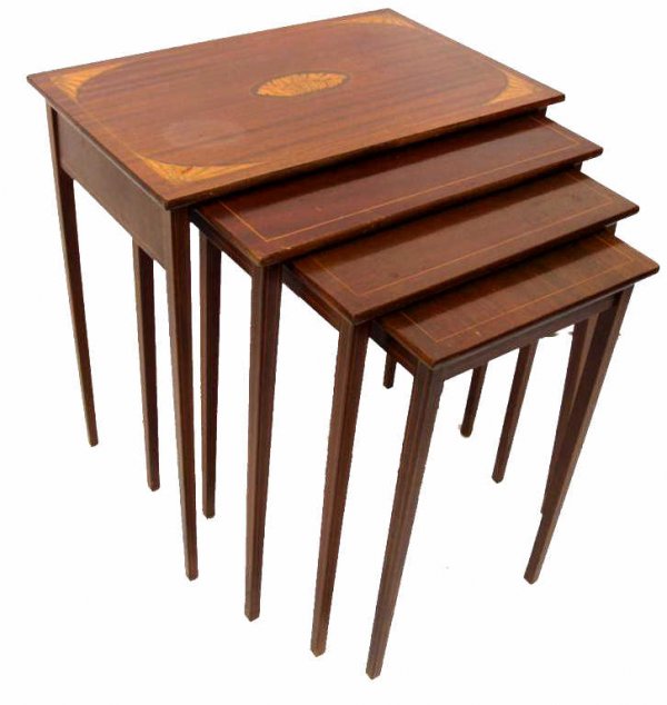 Sold(4) ENGLISH SHELL-INLAID MAHOGANY NESTING TABLES(set of 4) English shell-inlaid mahogany nesting tables, early 20th c., ornamented with shell mosaic top, over shaped apron, rising on stretcher-joined turned legs, ending in bridge feet, smallest tabSee Sold Price