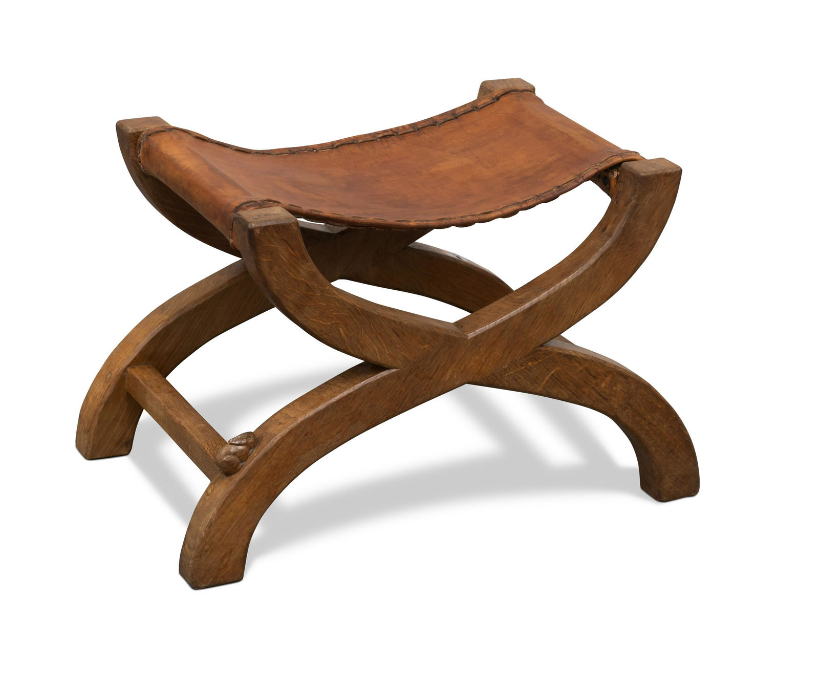 PETER HEAP, A RABBITMAN ADZED OAK CROSS-FRAME STOOL