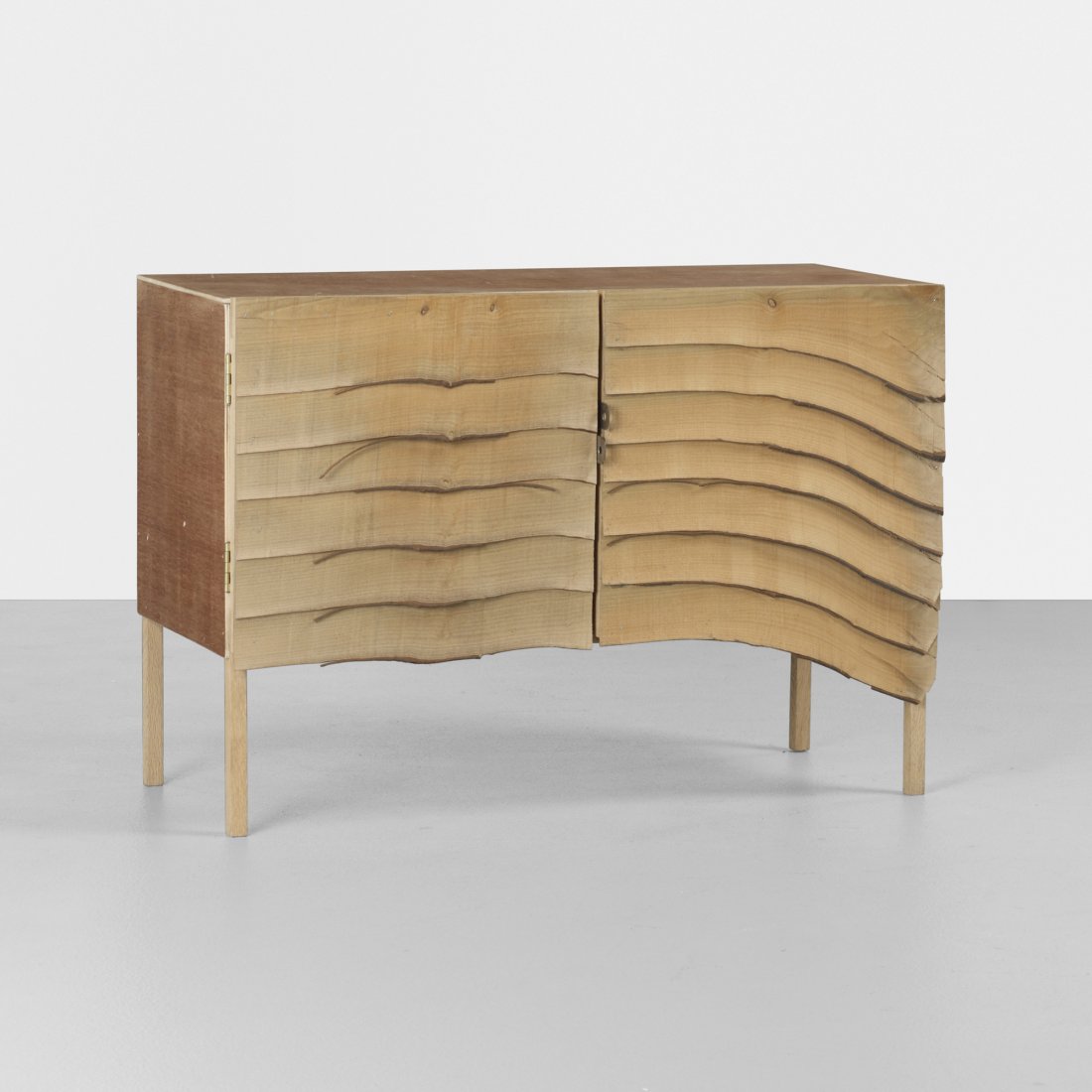 SoldGeorge Nelson & Associates, Thin Edge cabinetGeorge Nelson & Associates Thin Edge cabinet, model 5723 Herman MillerUSA, 1952teak, matte chrome-plated steel, porcelain67 w × 19.5 d × 32 h in (170 × 50 × 81 cm) CSee Sold Price