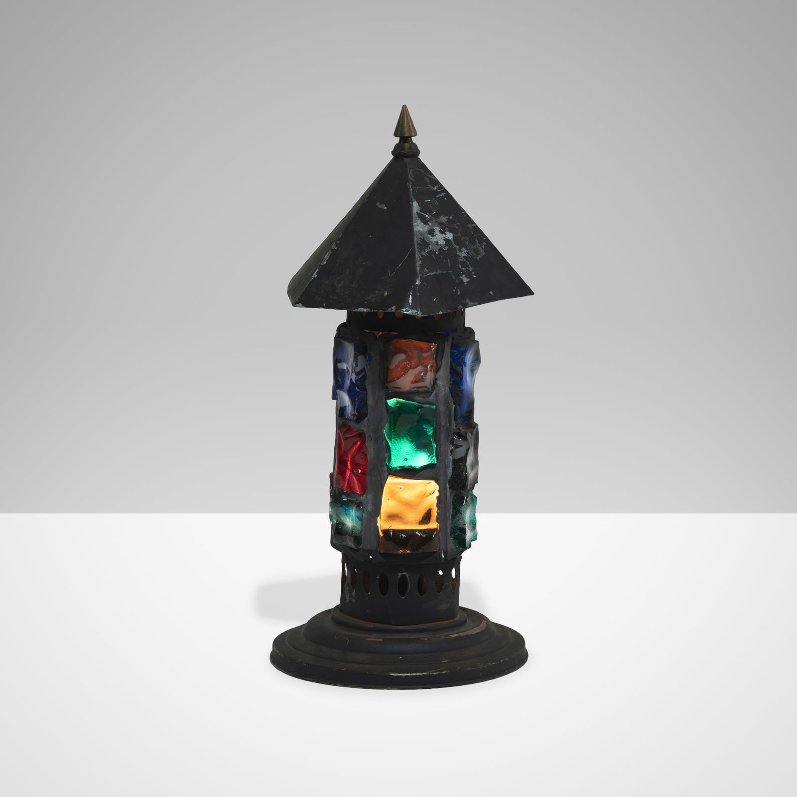 SoldPr PETER MARSH for NADER Lantern style Lamps Lanterns. Thick Chunky Colored Glass Elements. StainedPr PETER MARSH for NADER Lantern style Lamps Lanterns. Thick Chunky Colored Glass Elements. Stained Glass Chunks. Not marked. Dimensions: H: 12.5 inches: W: 6 inches: D: 6 inches ---See Sold Price