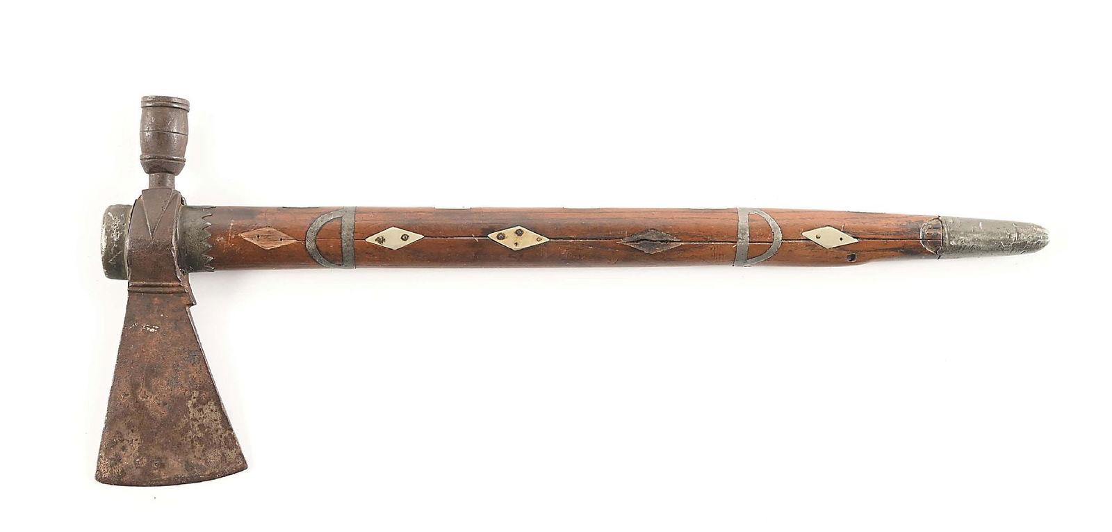 PEWTER INLAID PIPE TOMAHAWK.