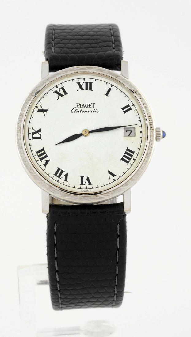 Piaget 18k Gold Automatic Watch 13455 A 618k white gold automatic Piaget watch, ref. 13455 A 6. 18k gold bracelet is 7.25" long, case measures 35mm at widest point x 30mm. Black metallic dial with silvered Roman markers, date located atSee Sold Price