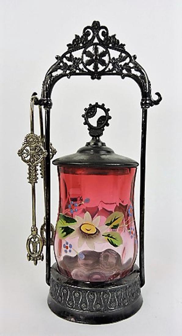 Pickle castor with cranberry floral enamel insert