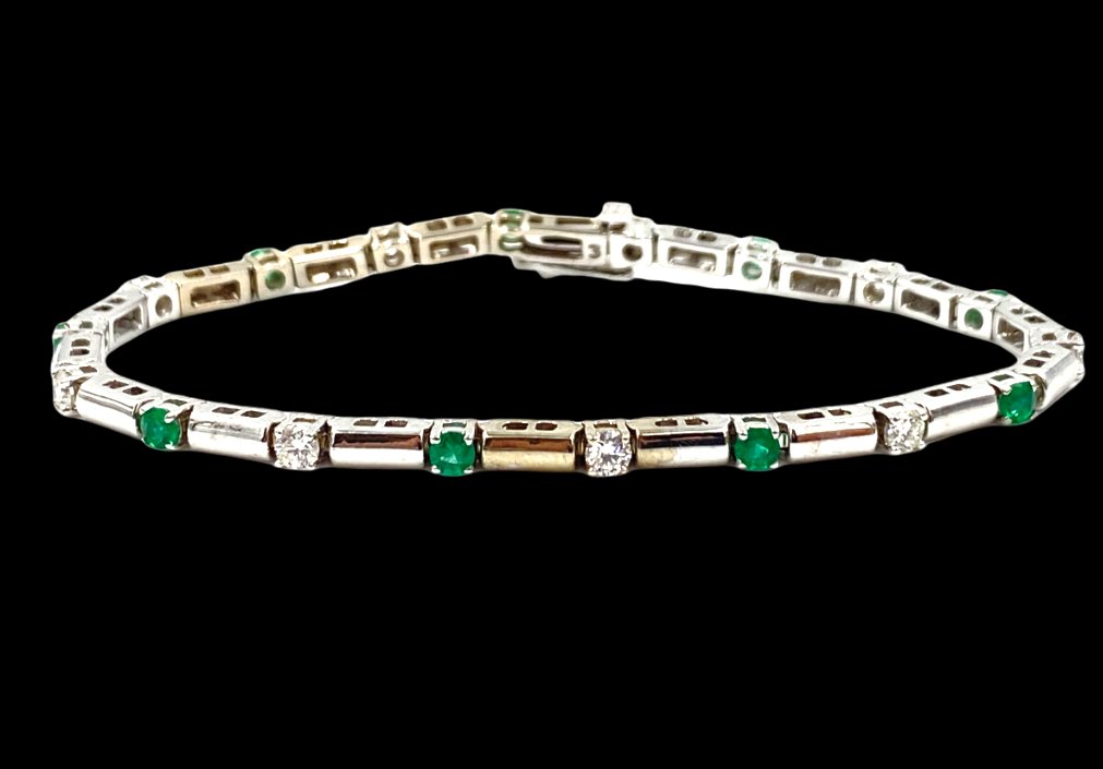 Sold14K White Gold 2.16 CTW Emerald & Diamond BraceletRef:23320119 Gold Content:14K White Gold For people:Women Total Item Weight:4.8grams Main Stone:Emerald Shape:Emerald Carat Total Wt:1.15ct Color:Green Cut Grade:G Adjacent Gemstone 2 : Diamond<brSee Sold Price